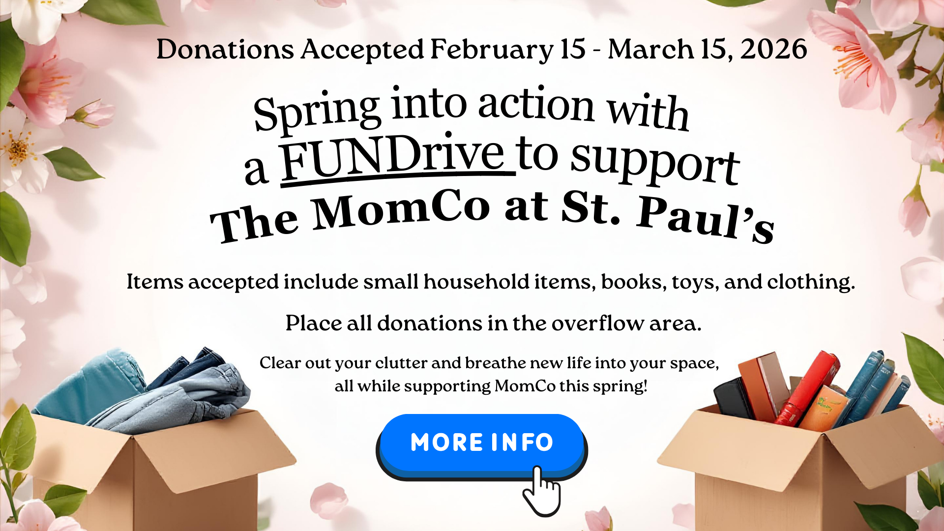 Meetups are held most 1st & 3rd Thursday evenings [6:30-8:30pm] and the 1st and 3rd Saturday mornings [8:30-10:30am] each month at St. Paul's (September 2025 – May 2026). Our kick-off meeting for the new season will be September 4th, 2025. Childcare available during these meetings as needed. Several playdate and mom’s night out opportunities as well!
